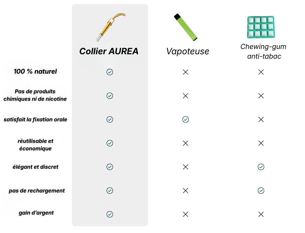 AUREA se distingue des vapoteuses et chewing-gums anti-tabac par une approche plus naturelle et durable. Sans fumée, sans nicotine ni substances chimiques, il aide à calmer le corps grâce à la respiration guidée.